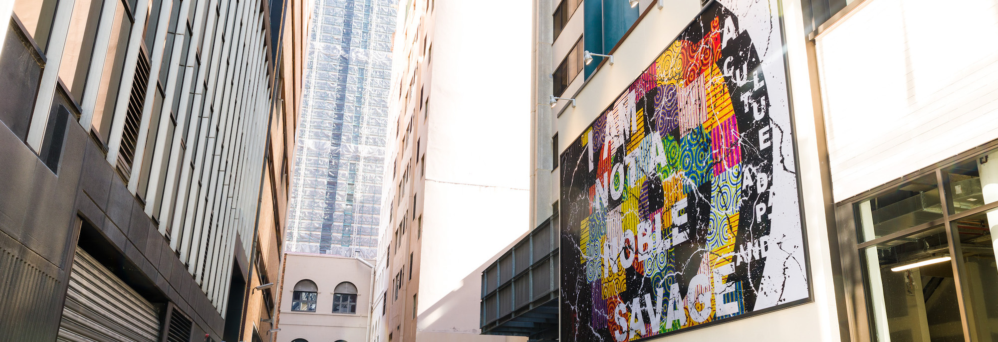 Main image: Life On A Mission, Richard Bell. 2009. Pictured in the Edison Lane Banner as part of Brisbane City Council’s Outdoor Gallery exhibition RAZZLE DAZZLE, curated by McCarthy-Swann Projects.