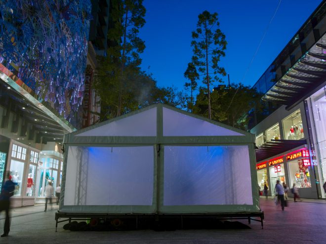 In this installation, Kinly Grey brought the sky to the street, inviting you to immerse yourself in a dense field of blue light.Using projected footage of the sky and fog machines housed in a pop-up structure, Kinly Grey transformed the wonder of the clear and distant blue Brisbane sky into an intimate, joyful experience.